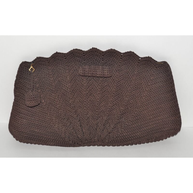 This 1940’s chocolate crocheted fan clutch purse has a pom-pom handle. Interior is fabric lined with one pocket.   16W