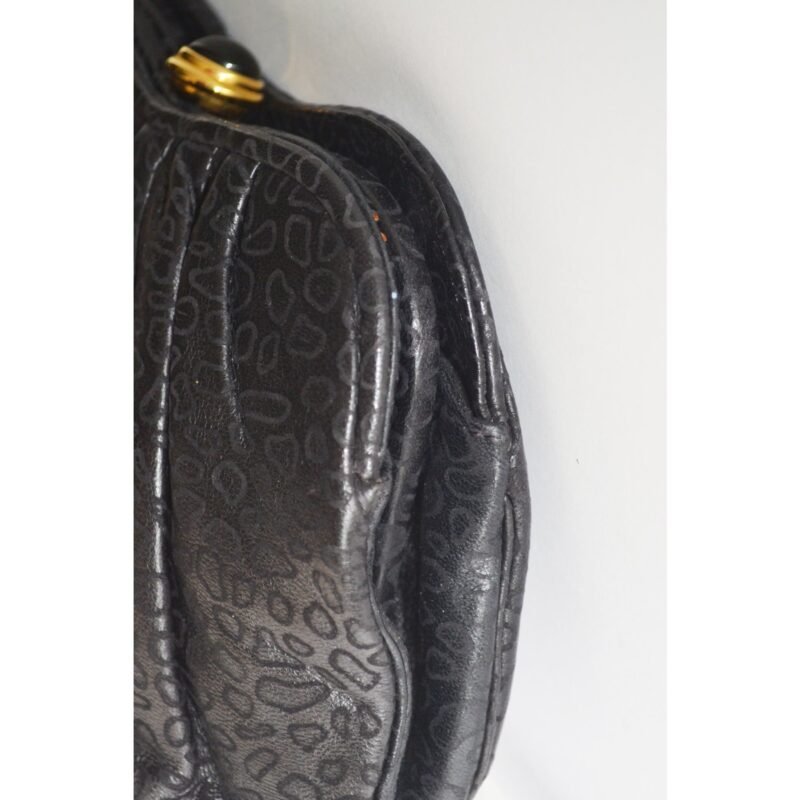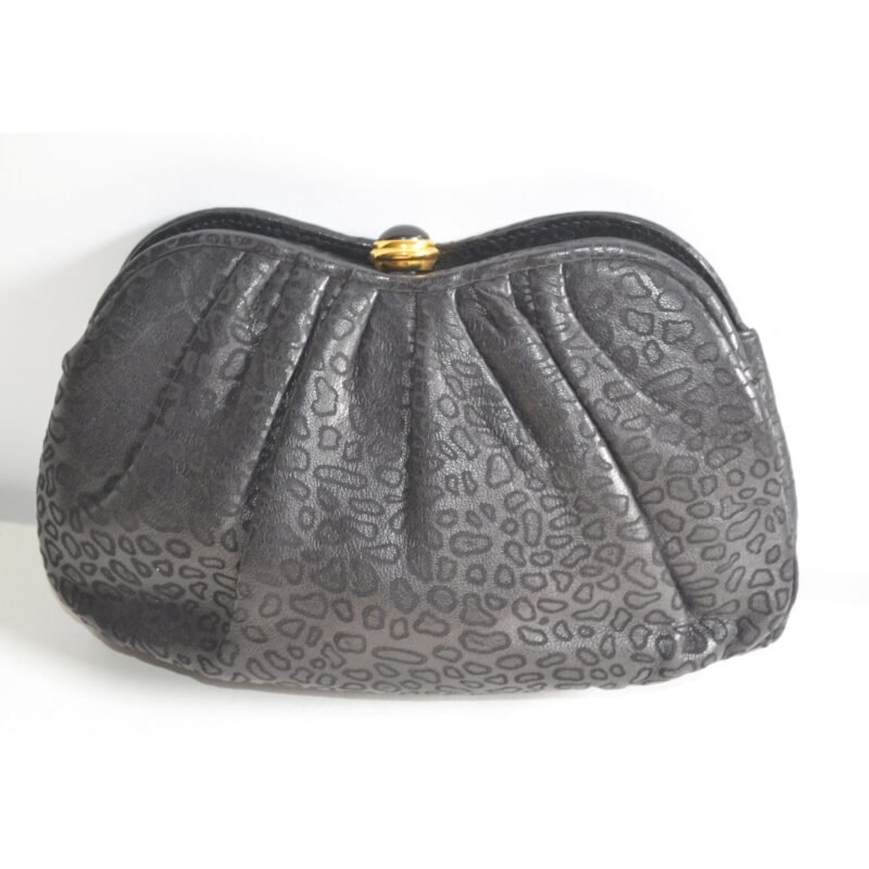 This embossed pleated black leather evening purse is from Tiras. Interior is fabric lined with two pockets (one zip). Has