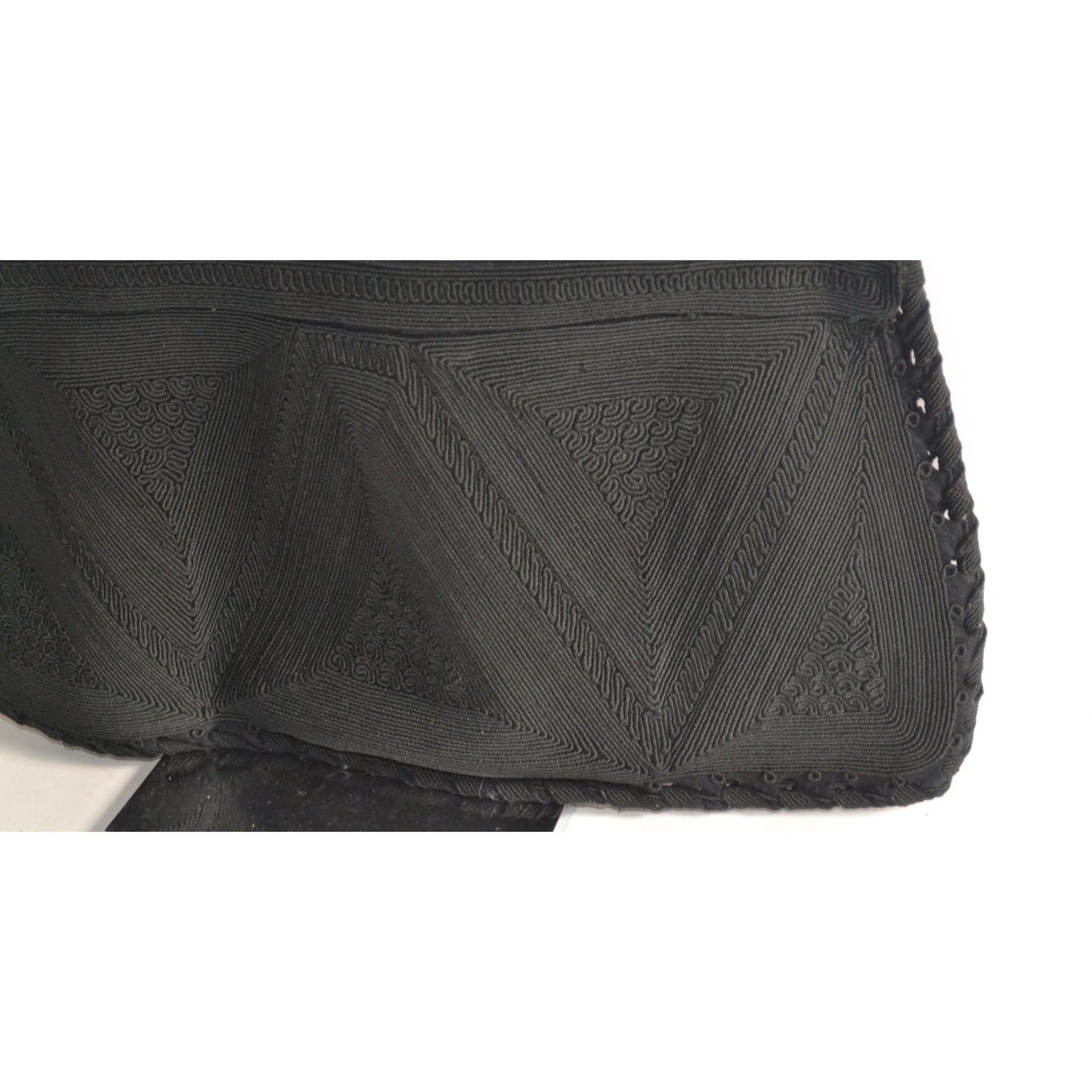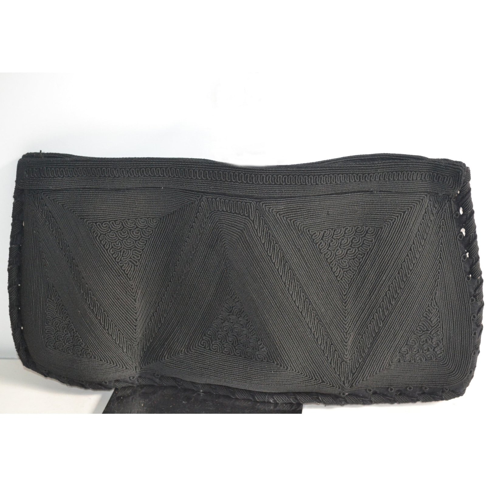 This embossed pleated black leather evening purse is from Tiras. Interior is fabric lined with two pockets (one zip). Has