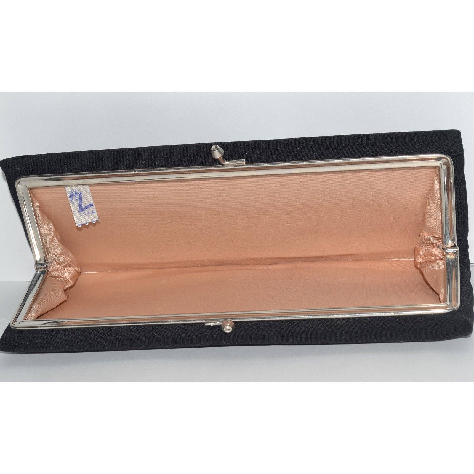 This simple and elegant vintage black clutch evening purse is from HL.  Interior is fabric lined.