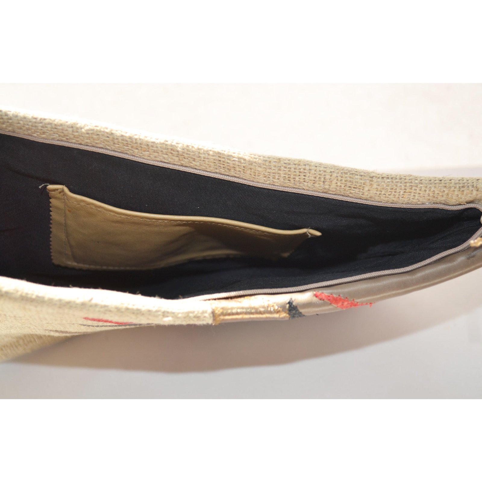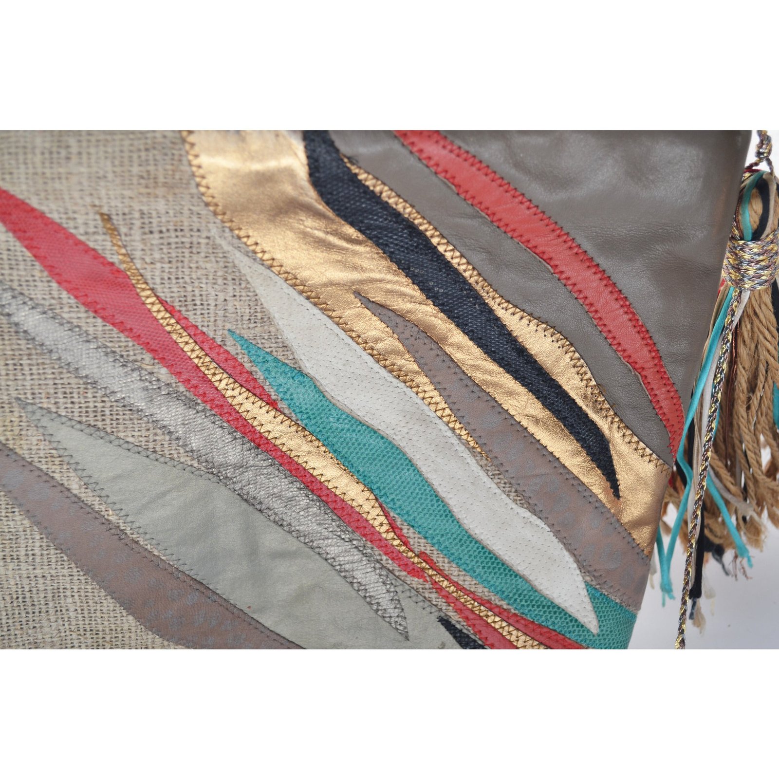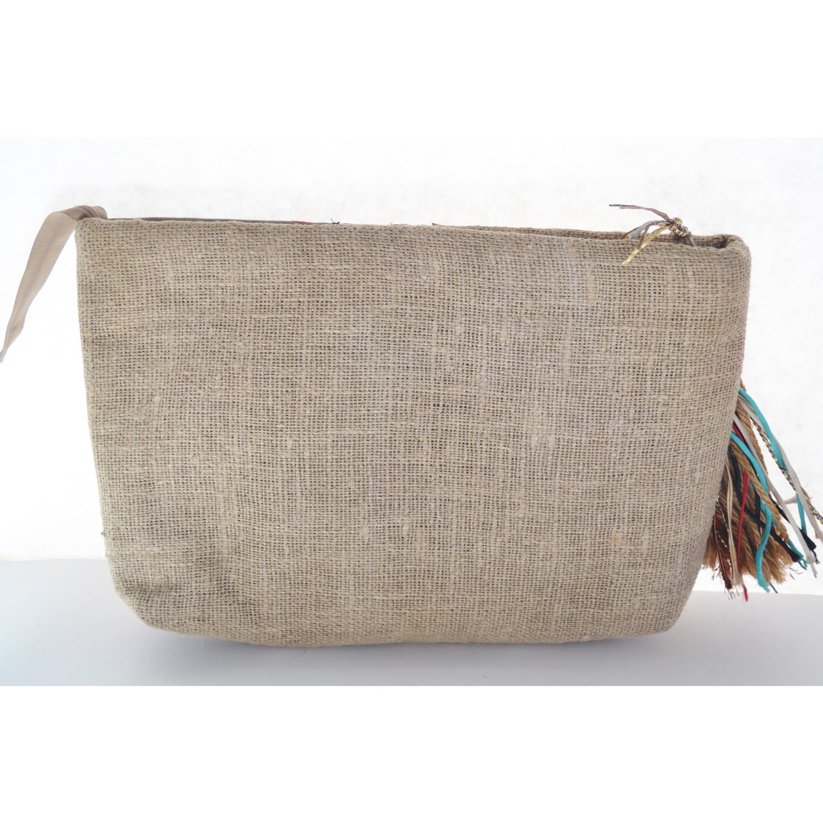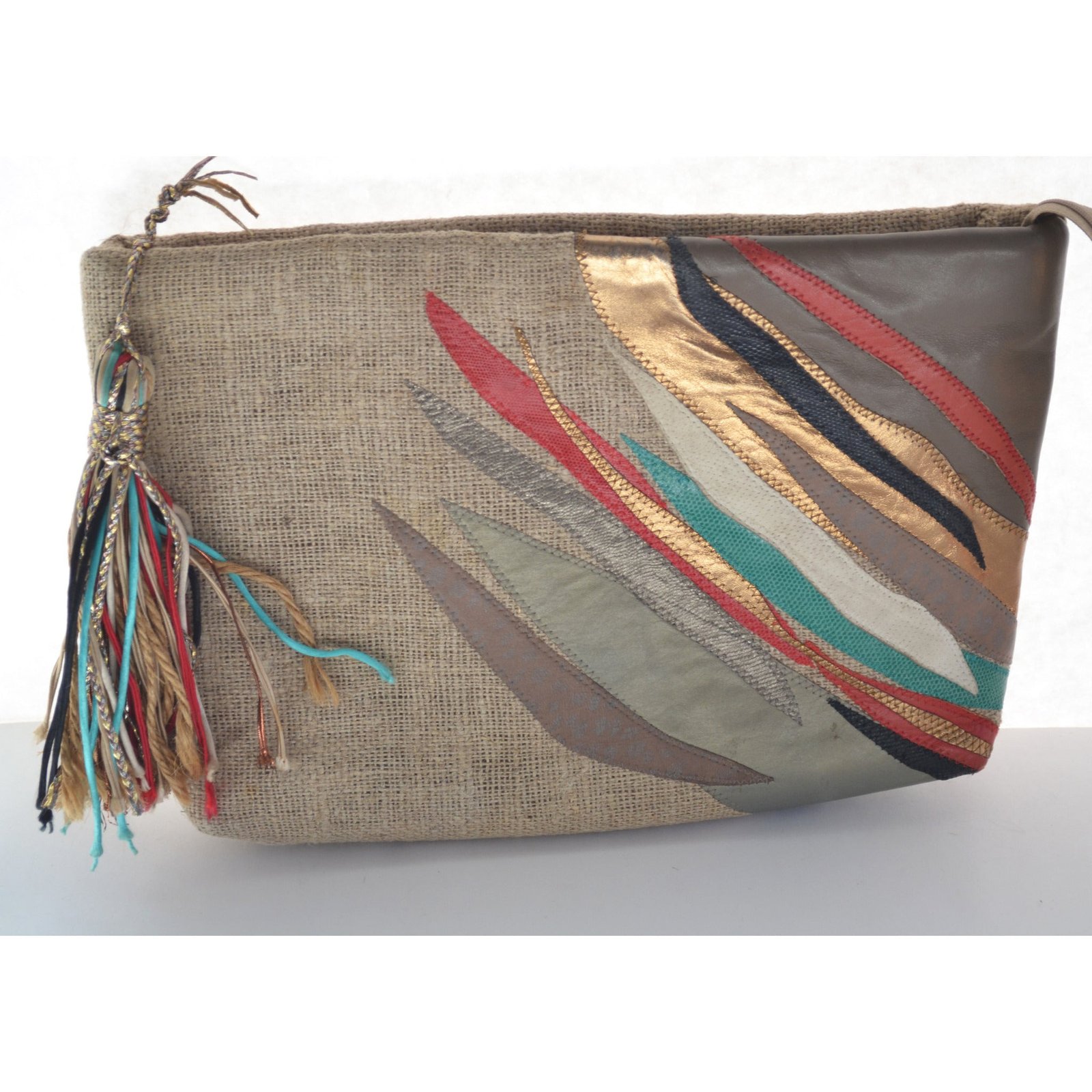 This oversized sexy vintage burlap clutch purse has colorful patch leather strips applied to the face. Has a multicolor tassel on the zip.  Zip to closes.  Interior is fabric lined with one pocket.