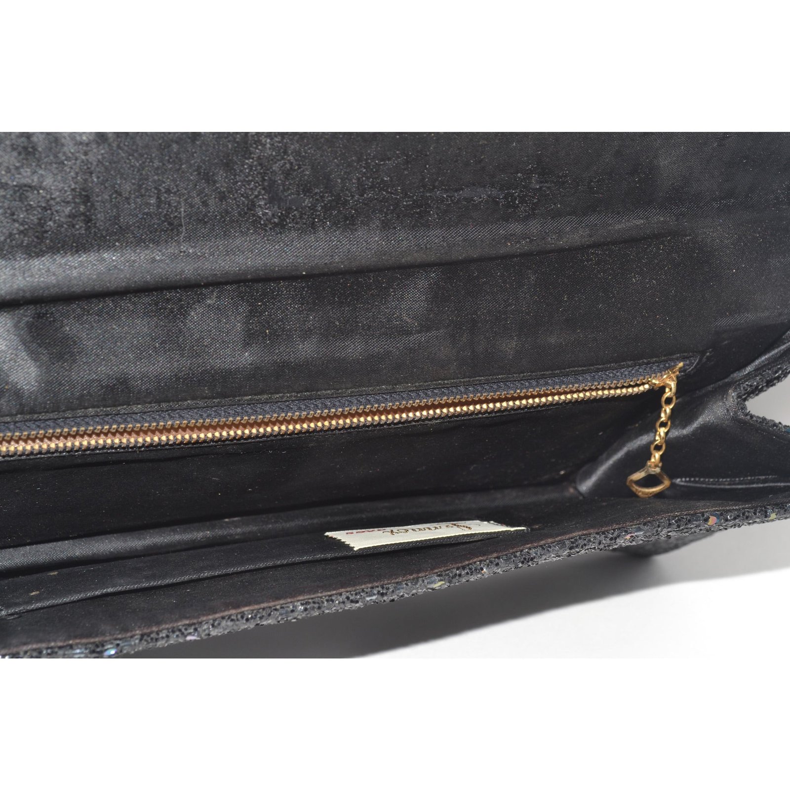 This vintage black sparkling glitter evening clutch purse is from Lennox. Interior is fabric lined with two pockets (one zip).